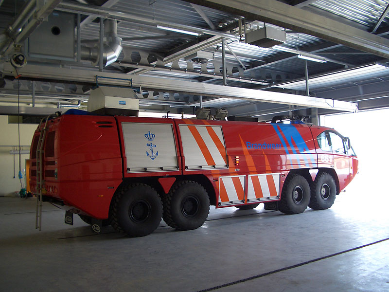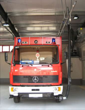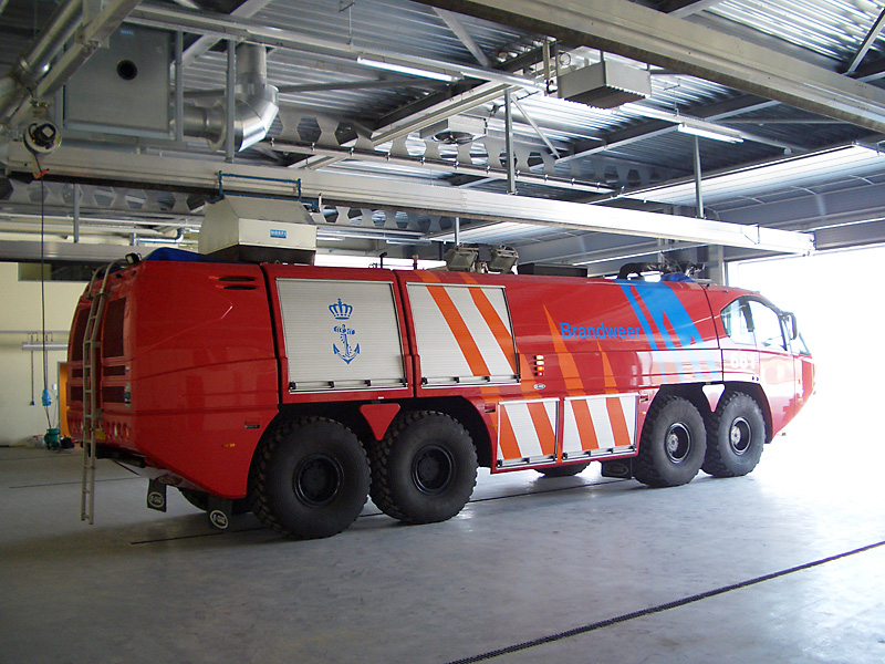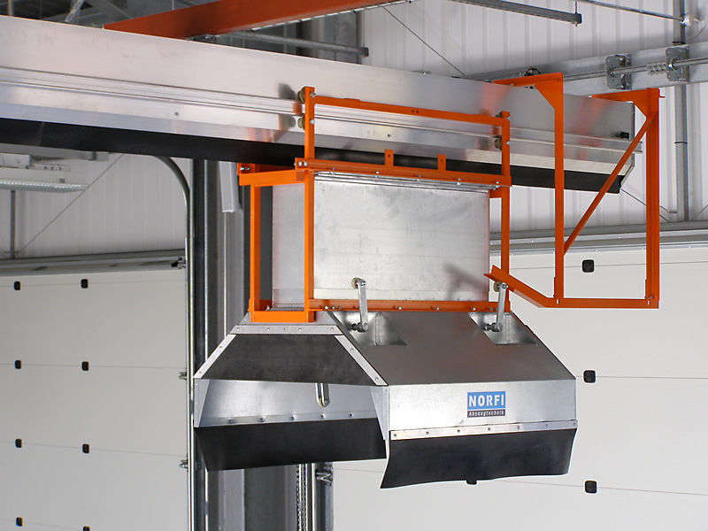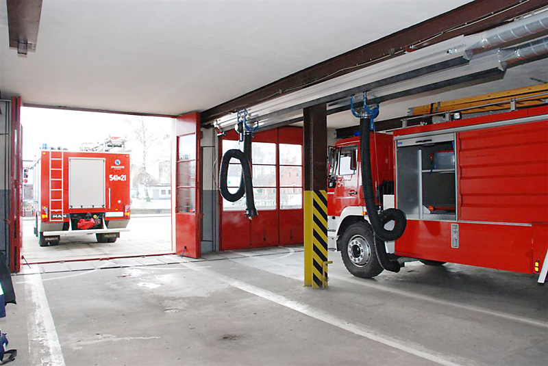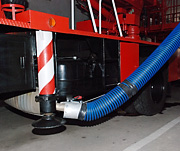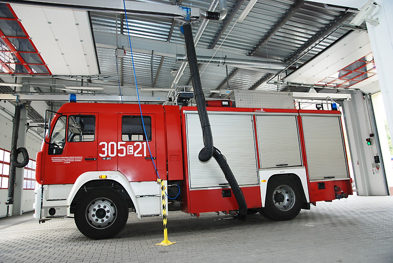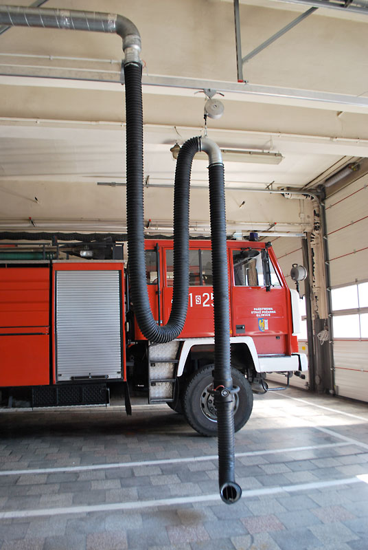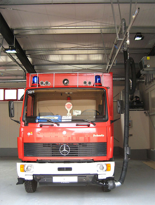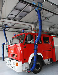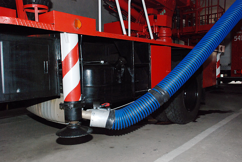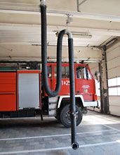 U těžkých vozidel letištních hasičských sborů jsou obvykle výfuky směřovány nahoru. Systém odsávání se skládá z kolejnice ALU 250, sacího vozíku a sací koncovky v podobě digestoře. Vozík je vybaven funkcí "vstup/výstup" blokující výfukové potrubí, při pohybu vozidla v garáži. Během cesty ven pak dojde k automatickému odpojení vozíku.