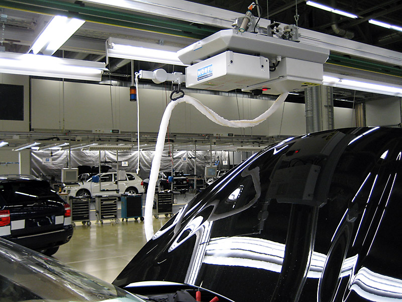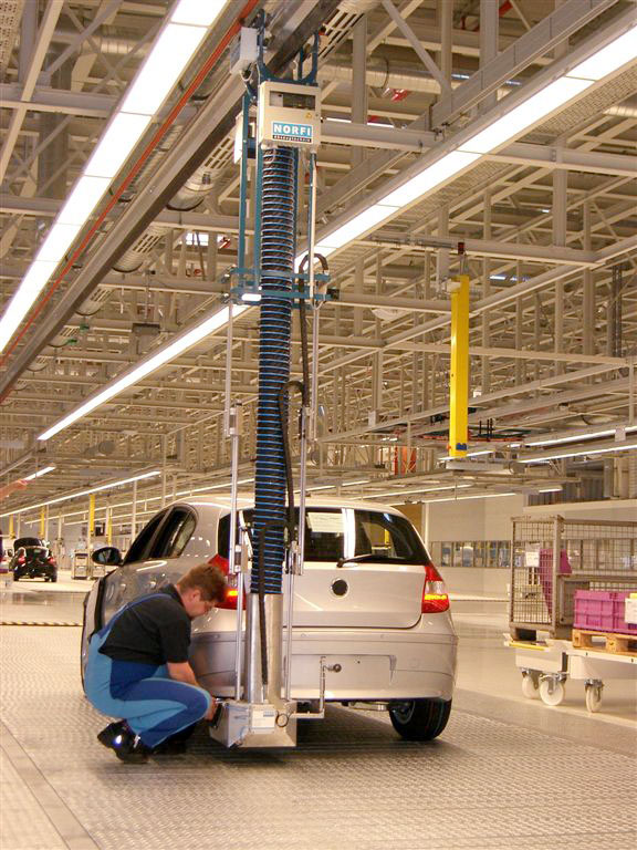 Pro montážní linky v automobilkách nabízí Norfi dva systémy - systém tradiční a systém bezkontaktní (non-contact). V tradičním systému se sací nástavec (koncovka) zakládá na výfukové potrubí ručně prostřednictvím obsluhy. Ostatní procesy jsou automatické. Odepnutí sacího zástavce z výfukového potrubí nebo návrat vozíku do výchozí pozice probíhá plně automaticky. Systém "non-contact" je plně automatický. Obsluha se nemusí starat o založení sacího nástavce, protože vozík na kolejnici si najde mezeru mezi vozidly a přizpůsobí svou pozici k výfukovému potrubí. Celek je řízen počítačovým centrem a jednotlivé komponenty komunikují spolu navzájem (každý vozík je plně autonomní).