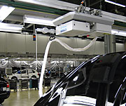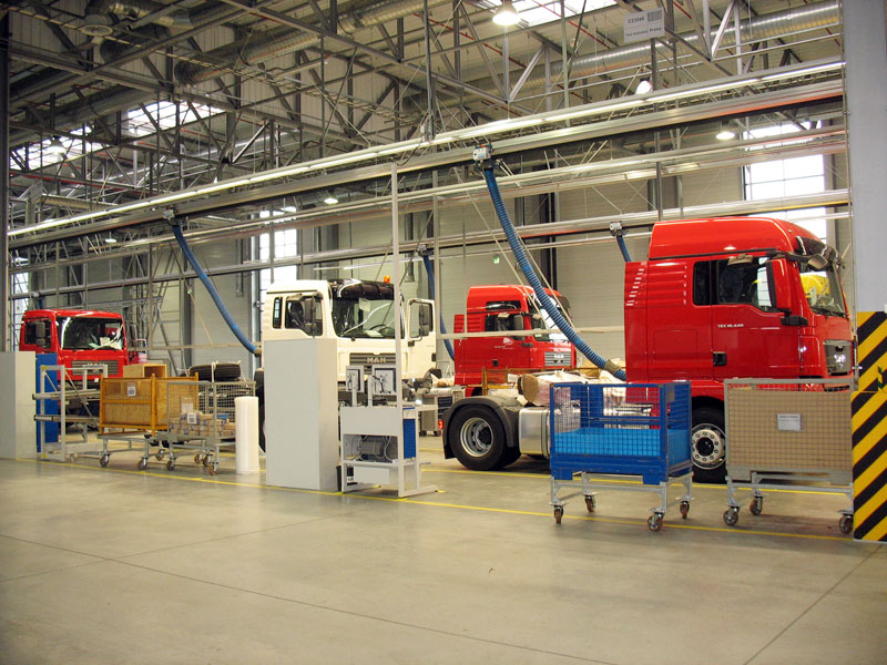 Průmyslové instalace odsávání výfukových plynů jsou plně integrovány ve výrobní lince. Umíme navrhnout jak standardní řešení pro stanoviště oprav, tak i plně automatický systém pro výrobní linky vytvořený na míru podle požadavku. Obsluha odsávání NORFI se v těchto případech zužuje pouze na zapnutí nebo vypnutí systému, ostatní procesy jsou automatické. U bezkontaktního řešení není zapotřebí ani vložení sacího nástavce na výfukové potrubí, systém je automatický a rozpozná vozidlo i polohu výfukového potrubí.