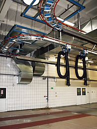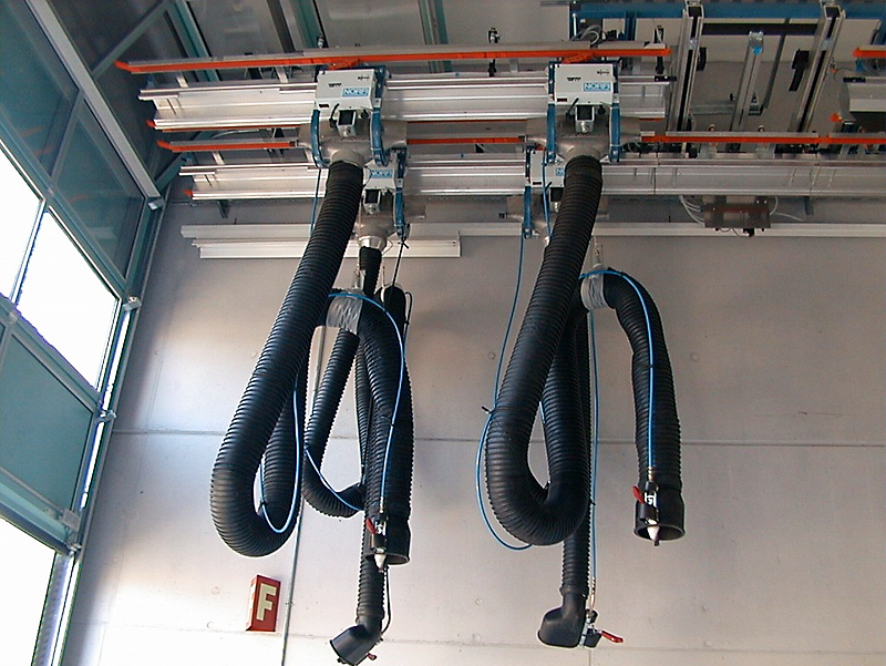 Pro servisní stanoviště, kde se vozidla pohybují jedno za druhým (např. autobusové garáže), aby návrat vozíků neblokoval systém, používá se oblouk se zpětnou dráhou pro odsávací vozík. V případě, kde situace v servise neumožňuje použit zpětnou dráhu s obloukem, nachází se v blízkosti odsávací kolejnice zpětná kolej, kde se vozík pohybuje zpět pomocí vyhýbky nebo zdviže.