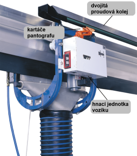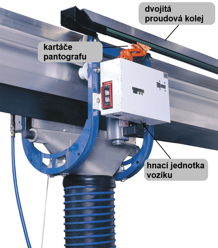 Automatický návrat vozíku se používá pro průjezdná stanoviště, ve kterých obsluha začíná v určitém bodě. Odsávací vozík se pohybuje za vozidlem až do místa, kde dojde k uvolnění sacího nástavce, pak se automaticky vrátí do své původní polohy. Souprava se skládá ze sběrače, kartáčů a troleje, umístěné na proudové kolejnici a odsávací kolejnice, po které se pohybuje odsávací vozík. Systém pracuje se stejnosměrným napětím 24V, motorový pohon obsahuje pryžové hnací kolečka s magnetickým přítlakem a snímače polohy.
