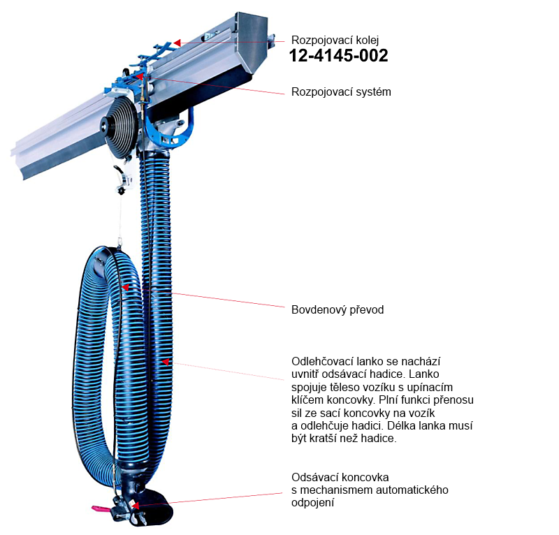 Systém mechanického odpojení se skládá z odpojovacího mechanismu kolejnice, odpojovacího mechanismu vozíku, bovdenu a sacího nástavce s funkcí automatického odpojení. Uvnitř hadice je uchyceno lanko, které chrání hadici proti poškození při odepínání sacího nástavce z výfukového potrubí.